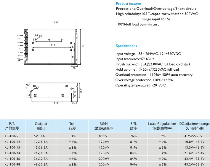 高可靠性:105C長(zhǎng)壽命電容,能承受300VAC輸入電壓5秒不損壞 100滿載老化測(cè)試 輸入電壓:88-132VAC,176-264VDC,249-370VDC 輸入頻率:47~63Hz 沖擊電流:35A@230VAC滿載冷態(tài) 保持時(shí)間:≥20ms@230VAC滿載 過(guò)載保護(hù):110%-150%自動(dòng)恢復(fù) 過(guò)壓保護(hù):110%~145% 運(yùn)行溫度:-20-70℃" />